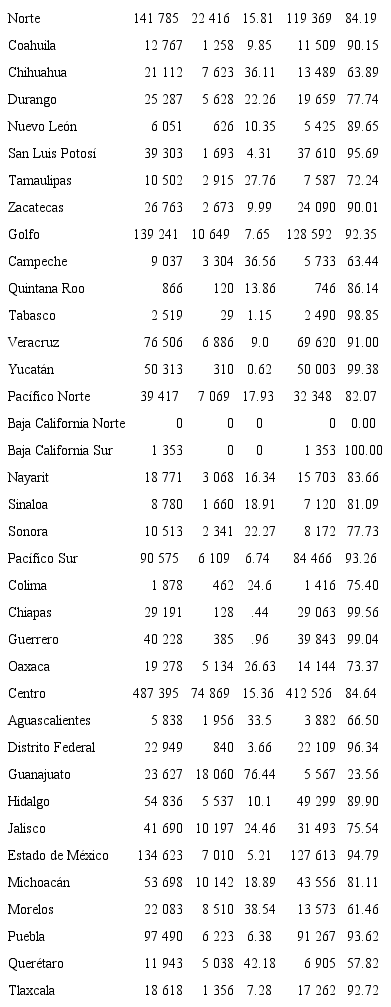 En segundo lugar, estaba el Centro donde se combinaban tres situaciones: entidades con abundante población indígena (Distrito Federal, Hidalgo, Estado de México, Michoacán, Morelos, Puebla y Tlaxcala), muy pobladas y donde las parcelas eran más pequeñas (Cuadro 5).