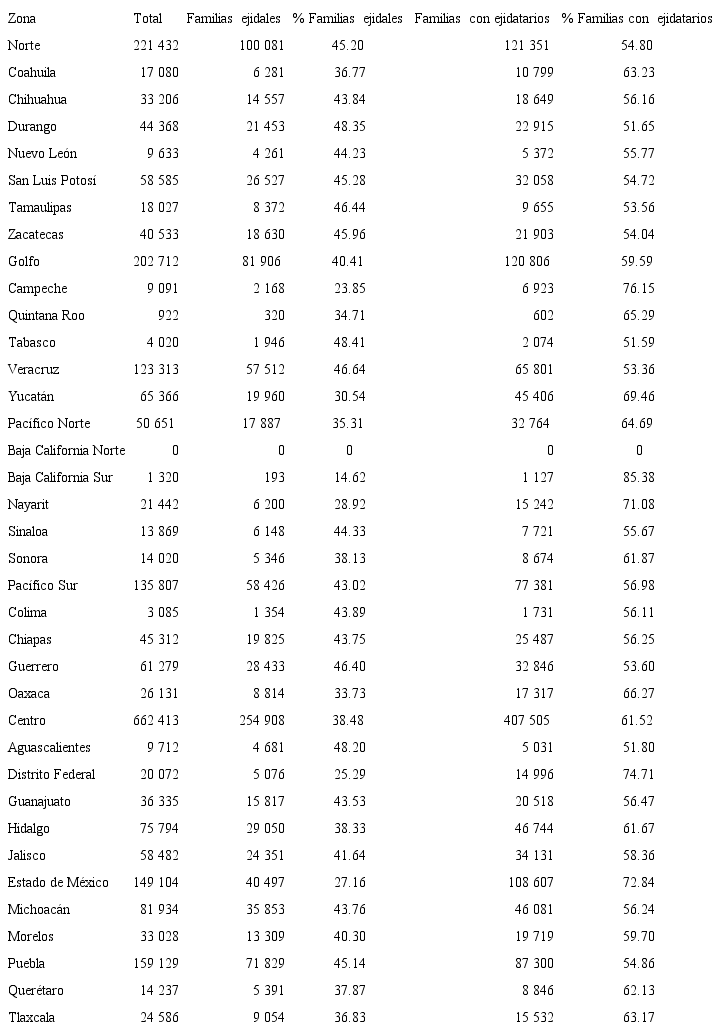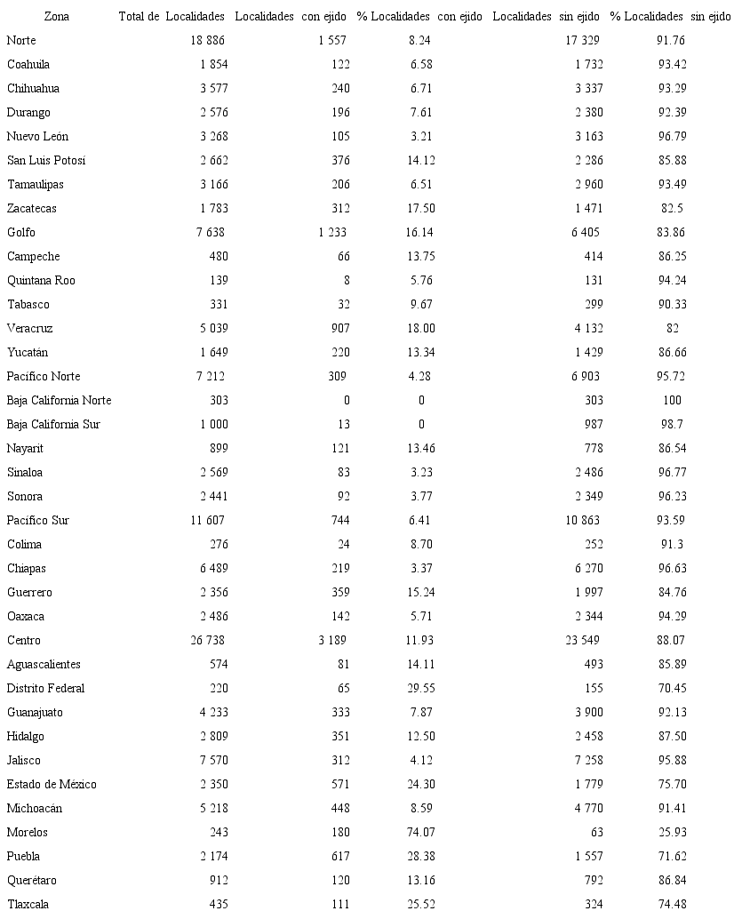 En general, se puede decir que existían fuertes contrastes entre las zonas y entre los estados dentro de cada zona. Un ejemplo: en el norte, la proporción de ejidos en Nuevo León representaba el 3.21 %, en tanto en San Luis Potosí y Zacatecas las proporciones se incrementaban a 14.12 % y 17.50 % respectivamente. En el Pacífico Norte y Pacífico Sur, los estados de Nayarit y Guerrero se destacan en cuanto a la proporción de ejidos: 13.46 % y 15.24 % respectivamente.