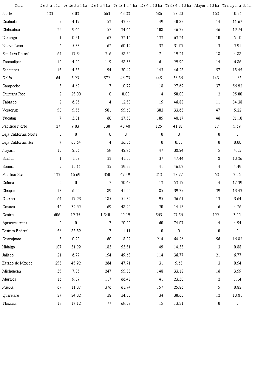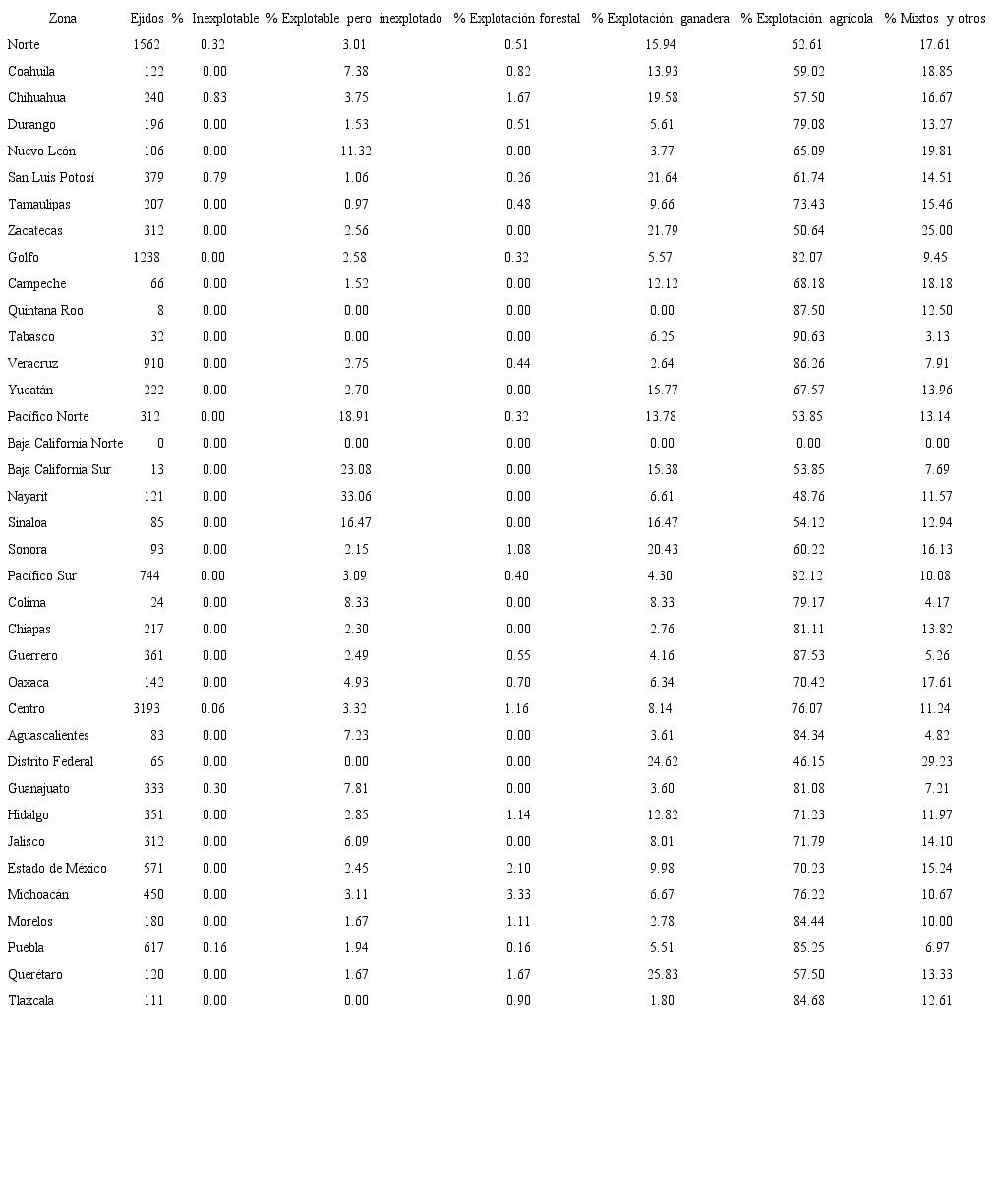 De acuerdo con la clasificación mencionada, predominaban los ejidos agrícolas en todas las zonas del país y, en especial, en el Golfo y el Pacífico Sur, ambas con entidades donde existían muchas comunidades indígenas. Se advierte la importancia de la ganadería en las zonas Norte y Pacífico Norte, en especial, en los estados de Chihuahua, San Luis Potosí, Zacatecas, Sonora, así como en el Distrito Federal y Querétaro en el Centro. La proporción de ejidos forestales era muy menor y sólo se advertían en los tres estados donde había explotación maderera: Michoacán, Estado de México y Chihuahua (Cuadro 7).