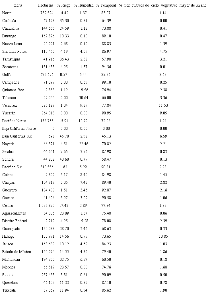 Las de riego eran las que disponían de agua por medios artificiales, proporción que apenas superaba la décima parte de las tierras ejidales (11.42 %). En el Centro y Pacífico Norte era donde había más ejidos con tierras de riego. Las de jugo o humedad eran las que conservaban una “humedad natural” y representaban apenas 3.72 % de las tierras ejidales y también predominaban en la zona Pacífico Norte: 10.79 %. Eso quiere decir que una cuarta parte de los ejidos de esa zona (25.74 %) disponía de agua de manera consistente. Las tierras de temporal, que eran las que “necesitan forzosamente la humedad del agua de lluvia” eran la mayoría: 81.71%. Esta situación imperaba en todo el país, aunque sobre todo en el Pacífico Sur, es decir, en los estados de Colima, Chiapas, Guerrero y Oaxaca: 90.81 %. Por su parte, las tierras con cultivos de ciclo vegetativo mayor de un año eran las que estaban ocupadas por árboles y arbustos frutales, que podían ser de riego o jugo. Ese tipo de cultivos predominaba en los estados del Golfo: Campeche, Quintana Roo, Tabasco, Veracruz y Yucatán: 8.63 %.