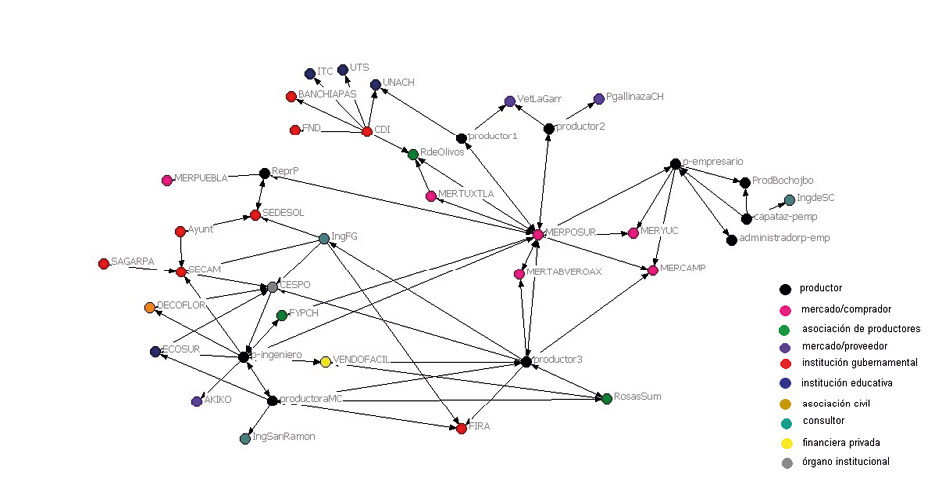 Ante esta situación los productores recurren a otros programas gubernamentales para adquirir recursos que invertirán en sus unidades productivas. En algunos casos se trata de programas ejecutados por dependencias distintas a las dos mencionadas arriba. De ahí que ciertos grupos de floricultores tengan una constante y bien valorada interacción con la Comisión Nacional para el Desarrollo de los Pueblos Indígenas (CDI) (ver nodo RdeOlivos en la Figura 1). Esta institución funge también como aval ante agencias crediticias y como enlace con centros académicos que promueven el fortalecimiento de capacidades en los floricultores: el Instituto Tecnológico de Comitán (ITC), la Universidad Tecnológica de la Selva (UTS) y la Universidad Autónoma de Chiapas (UNACH).