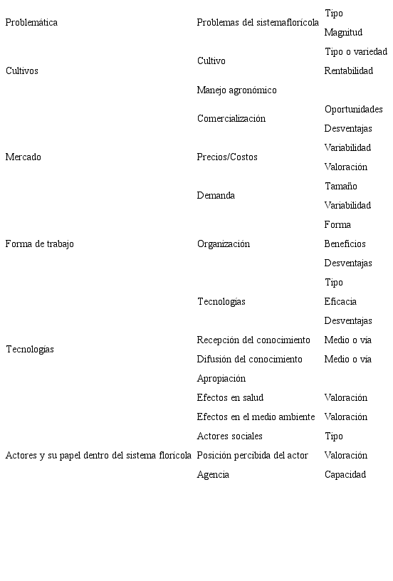 Se diseñó una entrevista para recabar información sobre lo siguiente: a) percepciones sobre las tecnologías usadas en la floricultura, b) papel de las personas entrevistadas dentro del sistema florícola, y c) valoración sobre los demás participantes del sistema florícola y de sus interacciones con ellos o con otras personas. Se efectuaron trece entrevistas semiestructuradas y tres abiertas; nueve de las primeras fueron dirigidas a productores y el resto a funcionarios estatales a cargo de proyectos agropecuarios, asesores técnicos, proveedores de insumos y comercializadores. Adicionalmente se realizó un grupo de discusión en el que se intercambiaron opiniones sobre el tema de las tecnologías usadas en el combate de plagas y enfermedades en la floricultura.