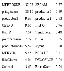 El mayor grado de intermediación lo concentró el nodo que representa el Mercado Popular del Sur (MERPOSUR) ubicado en San Cristóbal de las Casas, con 37.27 %. Éste vincula a productores con otros mercados, ya que concentra intermediarios comerciales. Destacan también dos subredes constituidas por actores de diversa naturaleza, cuyos nodos centrales los representa en cada caso un productor adherido a una organización (situación poco común en el sistema florícola): p-ingeniero y productor 3 (Figura 1). El primero cuenta con un grado de intermediación de 20.10 % y el segundo, de 9.67 %, lo que les ubica como el segundo y tercer “nodo puente” de la red. Los valores de intermediación de los actores que resultaron mayores a cero se presentan en el Cuadro 2.
