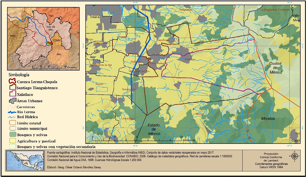 El sistema Lerma es parte de la Cuenca Lerma-Santiago que se configura con el sistema hidrológico Lerma, el lago de Chapala y el río Santiago —desde sus orígenes en la laguna de Almoloya, hasta el lago de Chapala y su desembocadura en el océano pacífico— conformando uno de los sistemas socioambientales de mayor extensión en el territorio nacional. La Ley de Aguas Nacionales considera a las cuencas hidrográficas como las unidades básicas para la administración del agua y el mismo ordenamiento establece los Consejos y Comités de Cuenca como órganos de concertación, abriendo espacios para la participación de los usuarios en la gestión del recurso. El primer Consejo que se estableció en el país fue el de la Cuenca Lerma-Chapala en 1993 y, en 1995, el de Valle de México al que pertenece el Sistema Lerma (Perevochtchikova y Arellano, 2008). La Cuenca se encuentra en el centro del país y comprende nueve entidades federativas; la subregión ubicada en el Estado de México consta de 43 municipios que son integrados de manera parcial o total (Conagua, 2013). Los municipios examinados se encuentran en la parte inicial del río, en el curso alto de la cuenca: el municipio de Santiago Tianguistenco cuenta con 97.86 % de su territorio dentro de la cuenca, mientras que Xalatlaco tiene 79.40 % (Mapa 1).