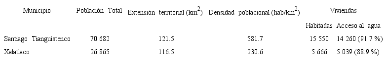 El primer municipio comprende un área irregular: tiene límites al sur con Ocuilan y Texcalyacac; al norte con Lerma, Capulhuac, Ocoyoacac y la Ciudad de México; al este con Xalatlaco; y al oeste con Metepec, San Antonio la Isla, Santa Cruz Atizapán y Almoloya del Río. Cuenta con infraestructura urbana amplia, está comunicado con las ciudades cercanas y es un centro de comercio regional, ya que todos los martes se lleva a cabo el tianguis que le da nombre, donde convergen productores y consumidores de los municipios aledaños. Por su parte, Xalatlaco es un municipio ubicado 50 kilómetros al sureste de la Ciudad de México, 32 kilómetros al suroeste de la Ciudad de Toluca y 75 kilómetros al noroeste de la Ciudad de Cuernavaca; es un municipio considerado como periférico y eminentemente rural, por lo tanto con una amplia disponibilidad de suelo (Venancio e Iracheta, 2015: 114). Las actividades económicas principales son la construcción de vivienda, comercio, cultivo de maíz y la extracción de madera (Cuadro 1).
