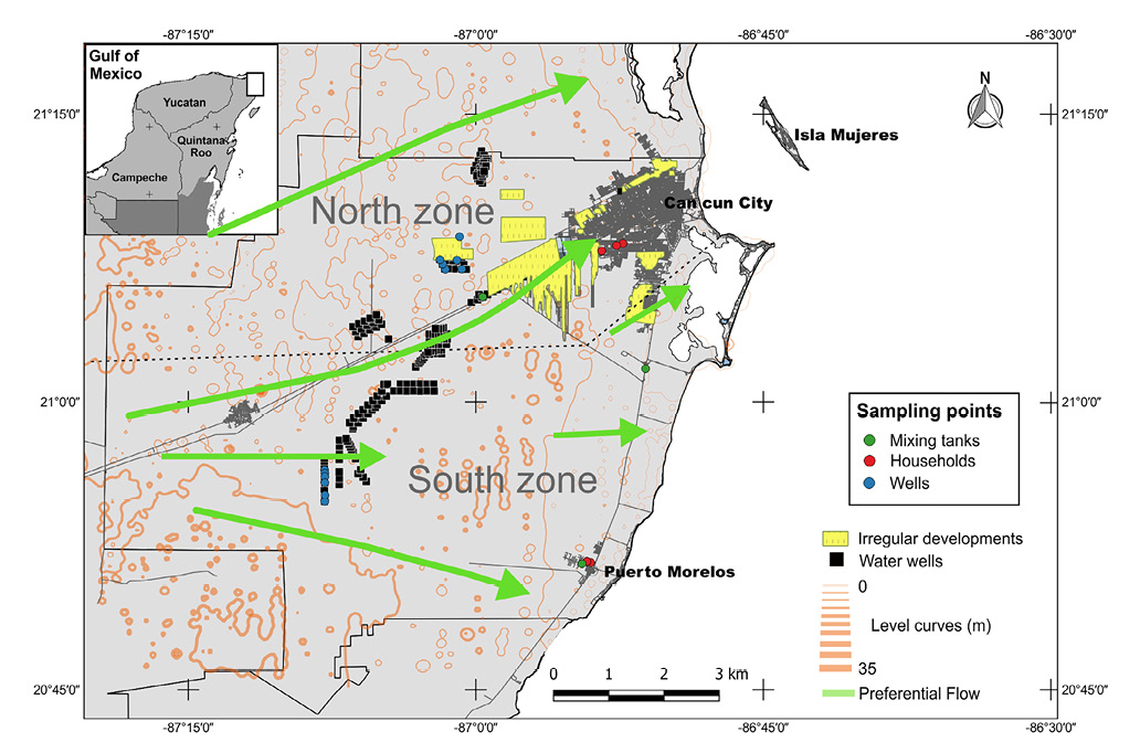 The unconfined aquifer used by CAPA and DHC-Aquakan is located in karst, which is highly vulnerable to contamination (Perry et al., 2002). The Yucatán Peninsula is a large, emergent carbonate platform with developed karst features. Dissolution of carbonate material along fractures is common, leading to karstic features such as sinkholes, caves of varying width and depth. The area has the following characteristics: 1) beneath almost the entire northern region, the fresh water lens is underlain by marine saline intrusion in close hydraulic contact with the ocean, 2) the freshwater lens is approximately 10 m thick near the coast, reaching a depth of approximately 60 m, 3) precipitation across Quintana Roo ranges from 1,100 mm to 1,500 mm annually. Rainwater is the main source of aquifer recharge, with 15 % of total precipitation percolating down to the water table (Moore, 1992). Precipitation rapidly penetrates the surface layer of caliche through fractures and moves through a highly permeable vadose zone to the water table. As a result, there are no surface streams more than few hundred meters long in the northern and northeast peninsula.