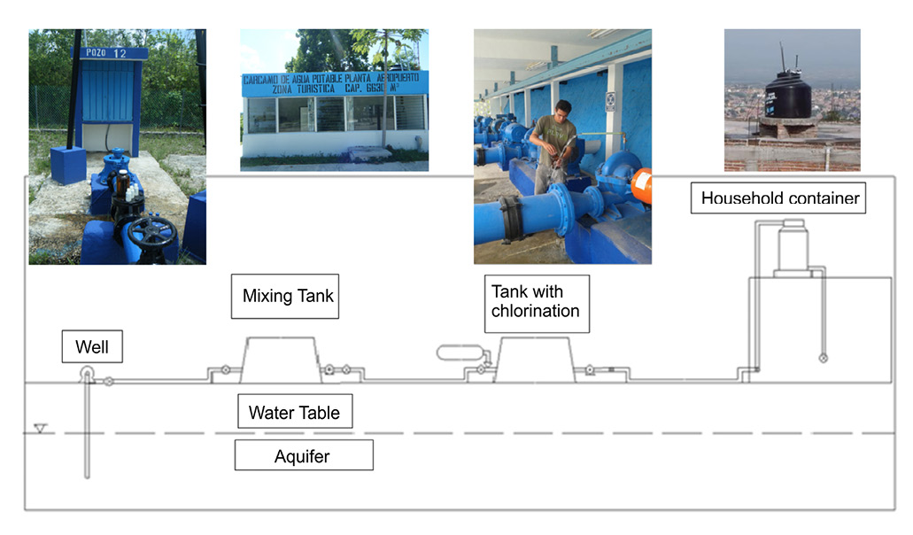 The aim of the study was to evaluate the water quality of a portion of the distribution system in Cancún, Quintana Roo, from the extraction site to the mixing point where chlorine is added, and in a selected set of residential storage containers. The study sought to determine the changes in water quality from the source to the end point and to determine whether recontamination occurred in the system during the rainy and dry seasons of 2011 and 2013. The study will establish whether the disinfection process effectively decreases the bacteriological load in groundwater once it has been transferred to residential storage containers and households.