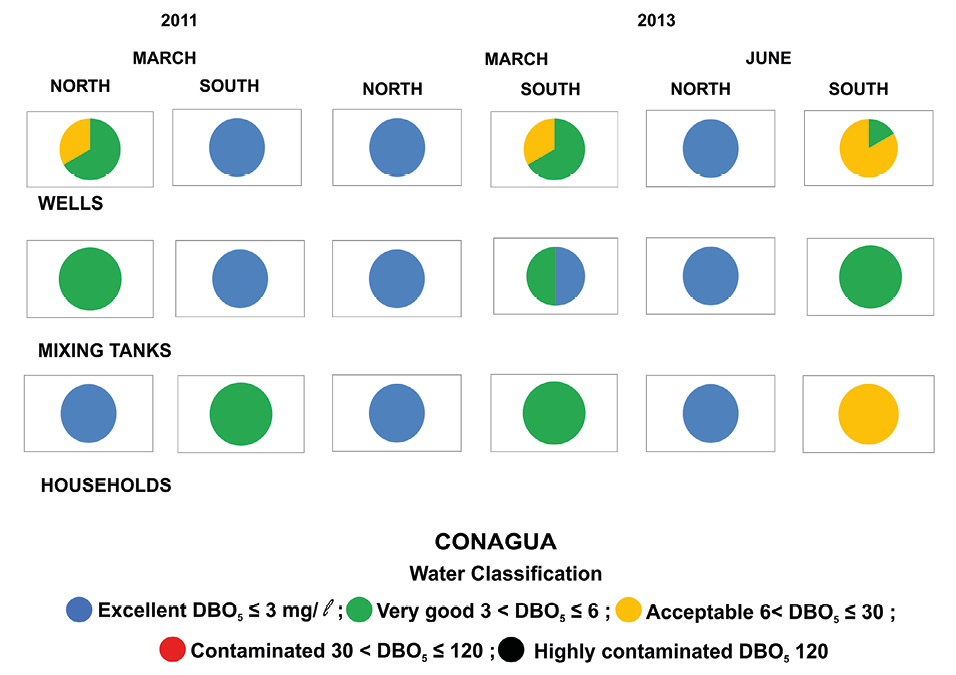 Source: Drought Prevention and Mitigation Measures Program (Spanish acronym PMPMS) 2014, National Commission for Biodiversity (Spanish acronym CONABIO) (http://www.conabio.gob.mx/informacion/gis/) and National Institute of Statistics and Geography (Spanish acronym INEGI) (http://www.inegi.gob.mx).* The entire number of household samples had excellent quality in 2011 in March, and in 2013, the entire number of samples were classified as excellent in March, yet by June, this classification had deteriorated.