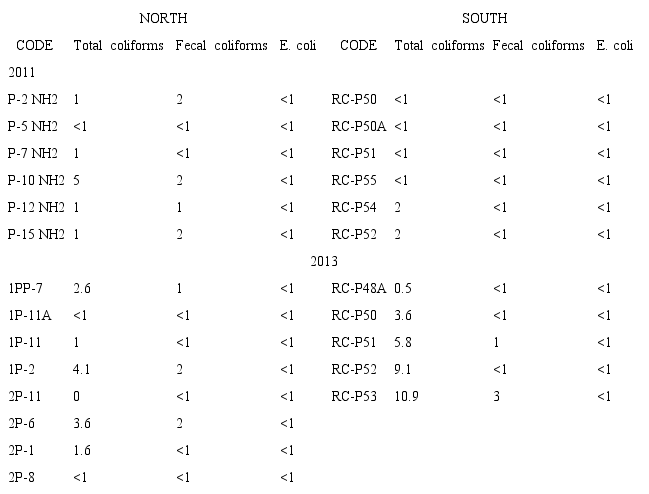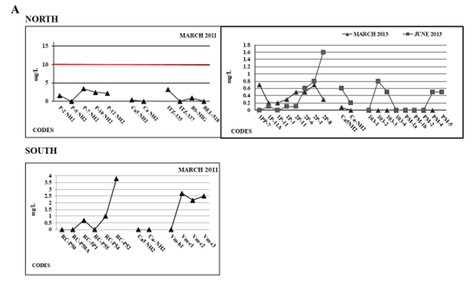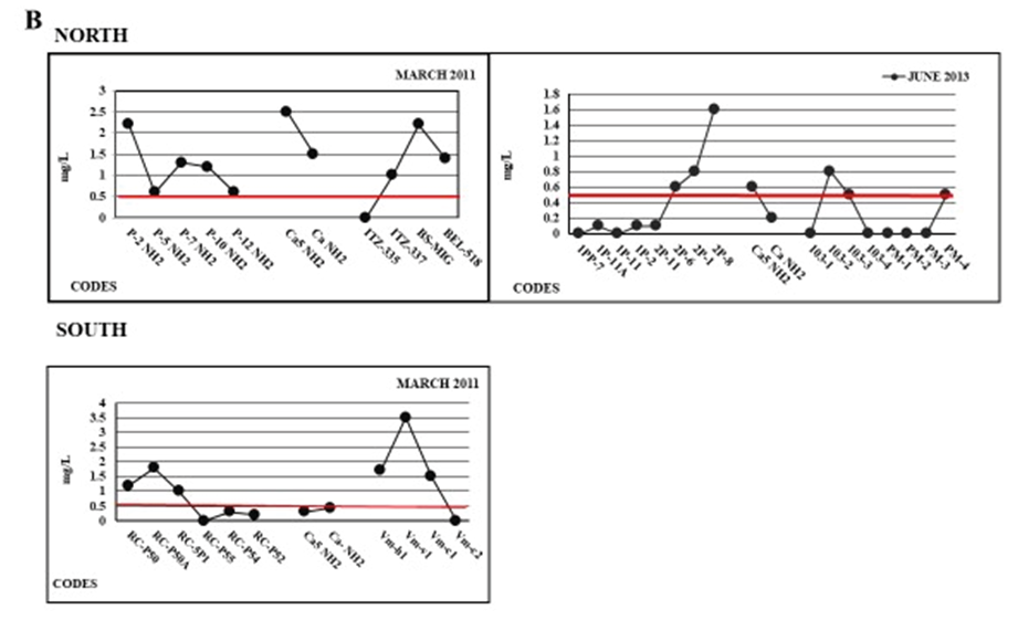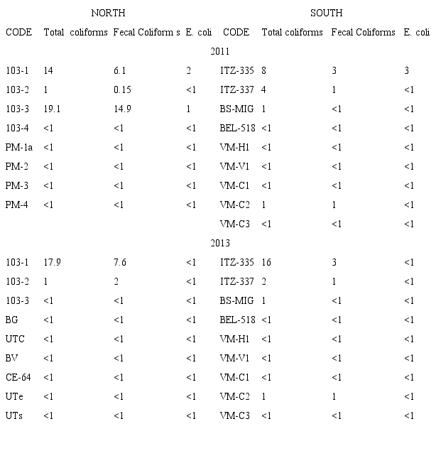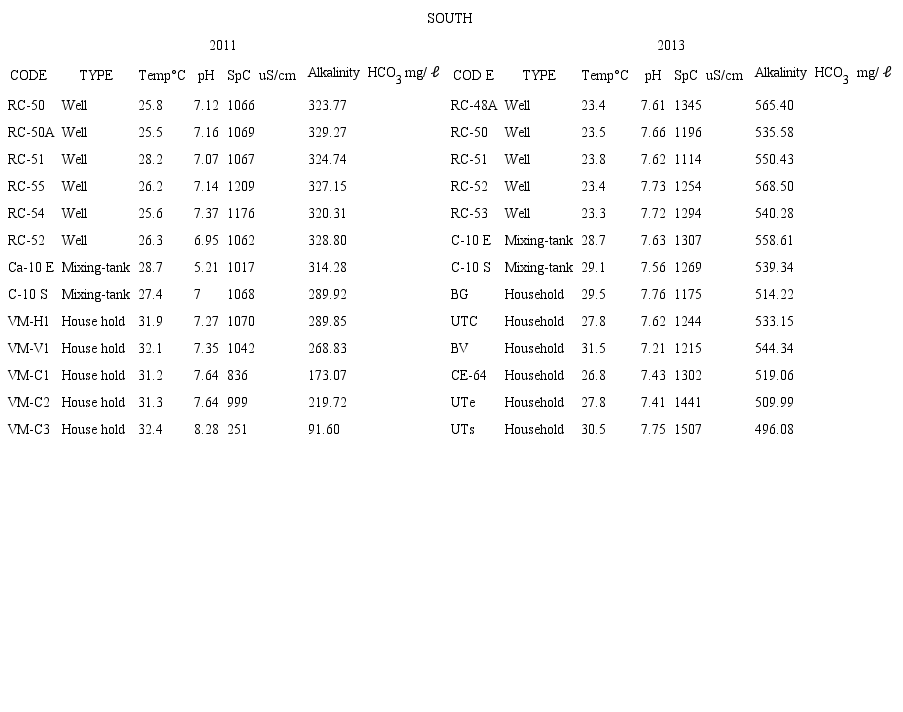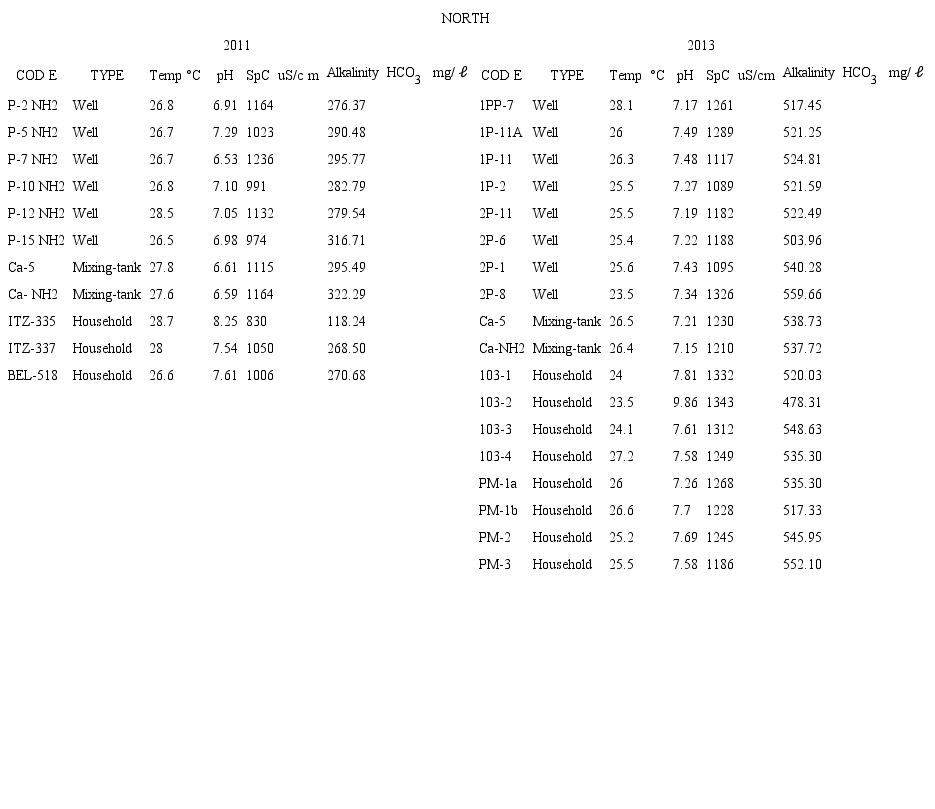 In general, the results showed data overlap (Table 1*). Between wells in the north and south zones, the temperatures ranged from 25.5-28.5 °C (2011) and 23.3-28.7 °C (2013), the pH ranged from 6.53-7.77 (2011) and 7.07- 7.73 (2013); and the EC ranged from 974-1230 µS/cm (2011) and 1089-1345 µS/cm (2013) which are similar values to groundwater in other parts of the region (Pacheco et al., 2000; Perry et al., 2002). The alkalinity values of the wells in the north were 276.37-316.71 HCO3 mg/ ℓ (2011) and 503.96-524.81 HCO3 mg/ ℓ (2013), and in the south they were 320.21-329.27 HCO3 mg/ ℓ (2011) and 535.58-568.50 HCO3 mg/ ℓ (2013).