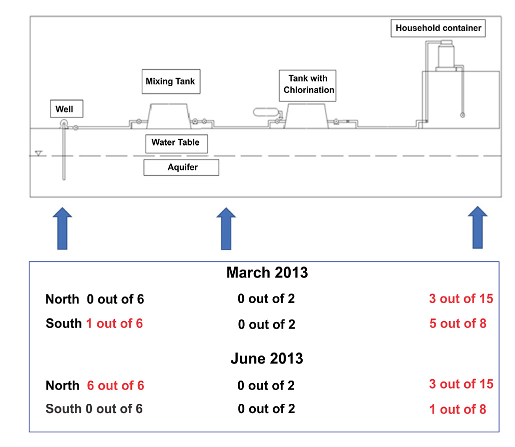 The bacteriological results indicated the presence of total coliforms at the well and in household containers (Table 2 and 3). In 2011, fecal coliforms were present in four wells and two household containers but none at the mixing tanks; moreover, none of the samples were positive for E. coli. In 2013, total coliforms was confirmed at the groundwater source (wells) where fecal coliforms were detected in three wells. However, after the chlorination process, the total number of coliforms was 0 MPN/100 mℓ for the wells. In 2011, fecal coliforms were detected in two households (3 and 6 MPN/100 mℓ) at the exit valve of containers. In 2013, only one household container reported the presence of fecal coliforms, also at the exit valve of the container.