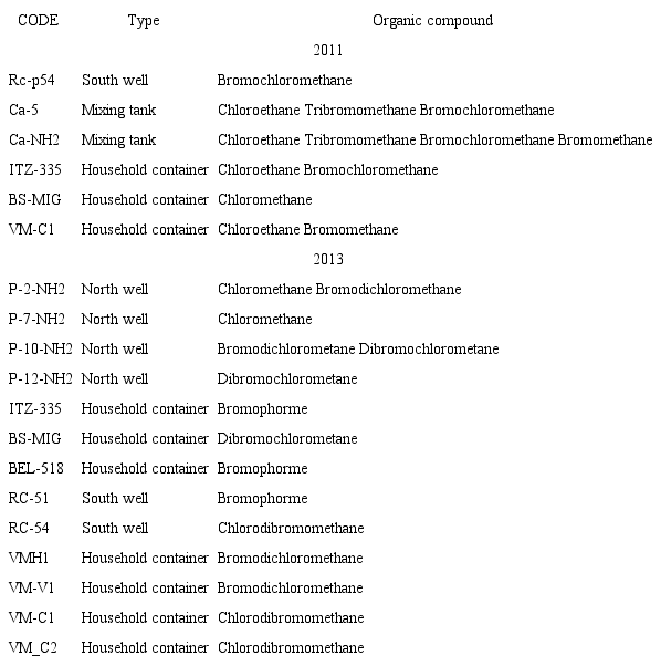 As mentioned before, THM groups were detected in wells during both periods and in eight household containers during the dry season in 2011 and 2013. There are two main reasons for this detection: 1) percolation of water from the surface into the aquifers in the well field occurs where there are irregular urban developments, and 2) an increase in BOD5 indicates a higher concentration of dissolved organic matter in household containers, which could lead to THMs as byproducts of residual chlorine (Garrido and Fonseca, 2009). Up to this point, the occurrence of THM compounds in wells indicates their relationship with anthropogenic activity due to infiltration into the aquifer, while confirmation of their presence in household containers could be related to their persistence and accumulation as a result of the increase in organic matter and total dissolved solids through the distribution system. This confirms the vulnerability of well fields where recharge control enables the infiltration of these compounds from irregular urban developments.