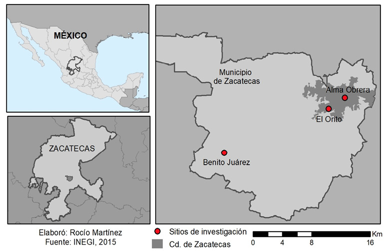 El trabajo fue realizado en Zacatecas por tratarse de uno de los estados con mayor avance en la promoción de la energía renovable, especialmente calentadores solares de agua. De acuerdo con la Base de indicadores de eficiencia energética de la Comisión Nacional para el Uso Eficiente de la Energía, 68.6 % de los hogares del estado utilizan este tipo de calentador, con 106 507 instalados (CONUEE, 2018). Se trabajó en dos zonas urbanas de la ciudad de Zacatecas (Alma Obrera y El Orito) y un ejido rural (Benito Juárez) que pertenece al mismo municipio porque en esos tres lugares recientemente se han implementado programas de entrega o construcción de calentadores solares de agua, iniciativas que serán descritas más adelante (Mapa 1).