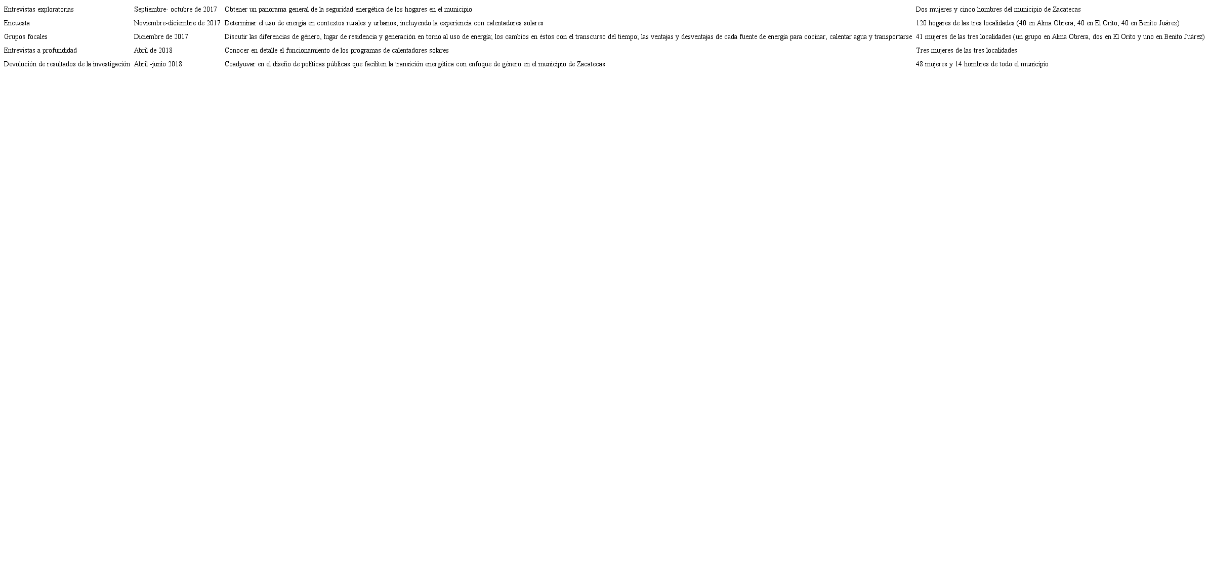 La investigación tuvo una duración de un año (julio 2017-junio 2018) y estuvo dividida en varias fases. En la primera se realizaron entrevistas exploratorias con informantes clave pertenecientes a organizaciones de la sociedad civil, instituciones gubernamentales y beneficiarias de programas de calentadores solares. Con la información recabada en este primer acercamiento se diseñó un cuestionario aplicado a 120 hogares. Dado que parte de los objetivos era comparar las experiencias femeninas con el calentador solar, la muestra fue dirigida y no representativa e incluyó 47.5 % hogares con calentador y 52.5 % sin calentador. Los datos del cuestionario fueron analizados mediante porcentajes de manera que simplemente describen el comportamiento de la muestra seleccionada.