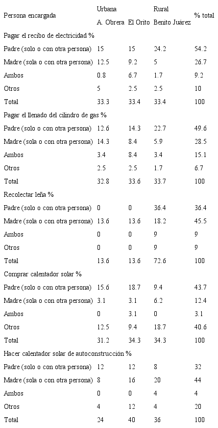 Tres cuartas partes de las mujeres (76 %) dijeron que su actividad principal es el hogar, con 30 % de Benito Juárez, 23 % de Alma Obrera y 23 % de El Orito. No es de sorprenderse que en el medio rural predomine un modelo más tradicional de familia donde el hombre es el proveedor económico y la mujer es quien realiza las labores domésticas (cocinar, lavar y planchar ropa, limpiar la vivienda). Una mayor proporción de mujeres de Benito Juárez en comparación con las de Alma Obrera y El Orito consideran que los hombres son los responsables de pagar el recibo de electricidad, llenar el cilindro de gas, llevar leña a la casa, comprar el calentador solar (en la categoría “otro” de este rubro entran parientes masculinos tales como padres, suegros, hijos) (Cuadro 4). Para Consuelo Rodríguez, habitante de este ejido, la transición de la leña al gas se dio justamente gracias a la intervención de sus hijos, quienes detectaron la necesidad: “yo en el suelo ponía mi tenamaste [fogón], pero luego (…) mis hijos me compraron la estufita”.