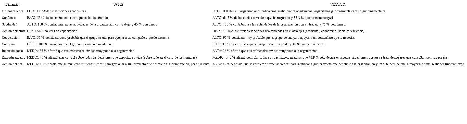 El cuestionario constó de 38 preguntas distribuidas en cinco dimensiones: 1) Grupos y redes, 2) Confianza y solidaridad, 3) Acción colectiva y cooperación, 4) Cohesión e inclusión social, y 5) Empoderamiento y acción política. En la Tabla 1 se definen dichas dimensiones, retomando la conceptualización del Grupo de Expertos en Capital Social del Banco Mundial (Grootaert et al., 2004). En total se aplicaron 41 cuestionarios, 20 a miembros de la UPByE y 21 en VIDA, A.C. Se obtuvieron estadísticas descriptivas. Además, para conocer algunos antecedentes e identificar las acciones colectivas que han realizado las organizaciones se aplicaron entrevistas semiestructuradas a los dirigentes.