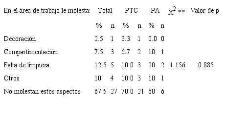 Fuente: elaboración propia.Con respecto a los aspectos de diseño, distribución o decoración del edificio o del espacio de trabajo, aproximadamente un 60 % de los encuestados de las dos categorías manifiestan que no les afectan éstos en su área de trabajo. Sin embargo, el resto de los ocupantes de los edificios reportan alguna molestia por la falta de limpieza y la distribución del espacio de trabajo, aunque no consideran este aspecto como grave (Cuadro 9).