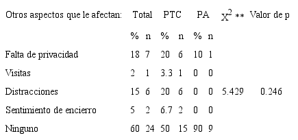 Fuente: elaboración propia.Con respecto a aspectos de privacidad, visitas, distracciones y sensación de encierro, se observa que un total de 24 trabajadores (60 %) reportan problemas de este tipo. Entre los factores con más prevalencia para los PTC fueron distracciones y falta de privacidad, con un 20 % para ambos aspectos. Por otro lado, se identifica que un 90 % del PA no sufre afectación por alguno de estos aspectos, debido a que está acostumbrado a la atención de personas (Cuadro 10).