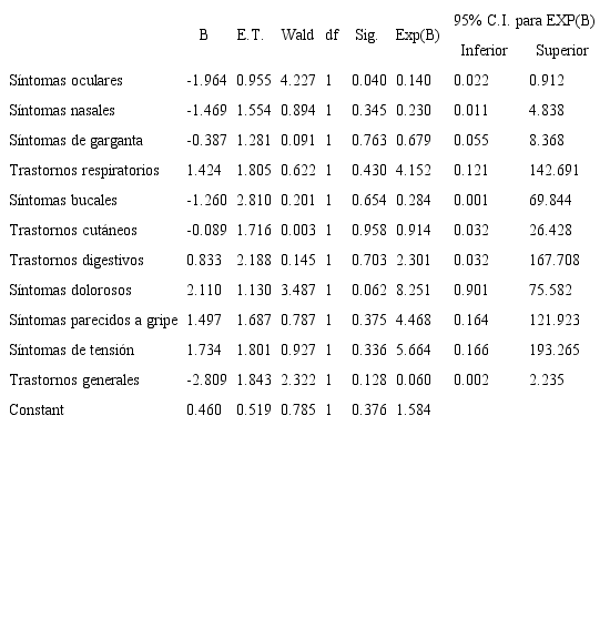 Fuente: elaboración propia.Los síntomas que pueden experimentar los ocupantes durante su jornada de trabajo son: oculares, nasales, de garganta, bucales, dolorosos, parecidos a la gripe, de tensión, trastornos cutáneos, respiratorios, digestivos y generales. En este caso, la variable independiente “síntomas oculares” explica a la variable dependiente “edificio enfermo” (Cuadro 12), debido a que la significación de B (0.040) es menor a 0.05, con un valor del coeficiente B de -1.964 y un error estándar de 0.955. A través del estadístico Wald se identifica que la variable predictiva “síntomas oculares” (Wald = 4.227) tiene una contribución individual significativa al modelo a predecir, es decir, la puntuación del estadístico Wald para el modelo probado indica que la variable independiente aporta significativamente a la predicción de la variable dependiente. Por lo tanto, los resultados obtenidos se pueden generalizar a toda la población.