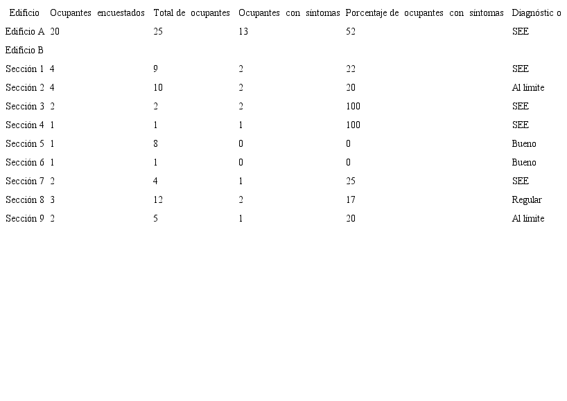 Por otro lado, de acuerdo con el análisis de los datos derivados del cuestionario, se puede diagnosticar al edificio A como edificio enfermo, debido a que muestra prevalencias mayores a 0.20, afectando a más de un 20 % de los ocupantes; mientras que en el edificio B, cuatro espacios presentan el síndrome SEE y dos espacios se encuentran en el límite permitido para considerarse como edificios enfermos. El INSST (1994) menciona que la causa principal en estos casos es la contaminación del interior debido a una mala calidad del aire (Cuadro 13).