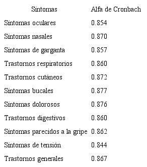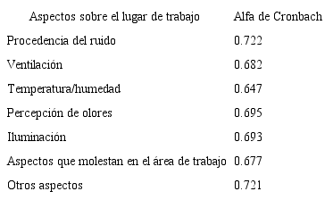 El coeficiente alfa de Cronbach para la sección del lugar de trabajo se evaluó como 0.724. En relación con los síntomas, el coeficiente fue de 0.875. En los Cuadros 1 y 2 se describen los coeficientes de confiabilidad para cada aspecto de las secciones evaluadas. En ambos casos el valor es mayor a 0.7, por lo que se puede confirmar que los datos muestran una aceptable consistencia interna del cuestionario.