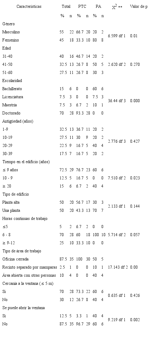 La población encuestada se compone de un 55 % de personal masculino y un 45 % de personal femenino. El 75 % de los encuestados son PTC y el porcentaje restante lo conforman PA. La mayoría de los trabajadores (70 %) tienen una antigüedad menor a cuatro años en el edificio. Un 50 % de la muestra del estudio se ubica en un edificio de siete pisos de tipo cerrado. Lo anterior permite efectuar una comparación entre sujetos en edificios nuevos frente a sujetos en oficinas antiguas y construidas con diferentes materiales. Es importante mencionar que en promedio los ocupantes en su puesto de trabajo tienen tres equipos de trabajo como computadoras, impresoras, teléfono y/o fotocopiadora.