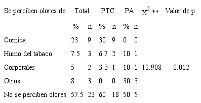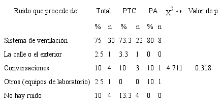 Fuente: elaboración propia.En el Cuadro 7 se muestra la fuente de los olores identificados en las oficinas de trabajo. El 30 % de los PTC (n= 9) detectan olores a comida. La mayoría de los PTC se ubican en un cuarto piso con un sistema de ventilación artificial, lo que puede indicar que el sistema de extracción del aire no funciona adecuadamente. El PA reporta otro tipo de olores en un porcentaje alto, de los cuales no se especifica la fuente. Algunos gases y vapores ocasionan incomodidad sensorial debido a olores y molestias ligeramente irritativas que pueden producir sensación de ansiedad y estrés, especialmente cuando sus fuentes no están identificadas (INSST, 1994).