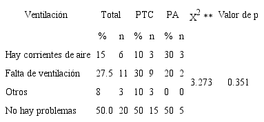 Fuente: elaboración propia.En cuanto a ventilación se observa que un 30 % (n=3) de personal administrativo, que normalmente trabaja en áreas abiertas, reportó sentir corrientes de aire. Por otro lado, los PTC registraron falta de ventilación, en tanto que su espacio de trabajo se caracteriza por un edificio relativamente nuevo, sin ventilación natural y ubicado en el cuarto piso. En general no se observa diferencia significativa entre las categorías de trabajo (p ≥ 0.05). Además, se observa en ambas categorías que 50 % de los ocupantes no detecta problemas con el factor ventilación (Cuadro 5). Cabe mencionar que una adecuada ventilación permitiría mantener el ambiente limpio y confortable para sus ocupantes, disminuyendo los riegos de enfermedad y estrés.