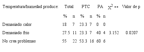 Fuente: elaboración propia.En cuanto a sensación térmica, la metodología no incluyó una inspección del tipo de vestimenta del trabajador, sino sólo de su percepción sobre el tema. Cabe mencionar que en general los ocupantes portan la camisa institucional (confeccionada de 100 % algodón) en los días laborales. De acuerdo con los resultados de la encuesta se pudo observar que 23 % (n=7) de los PTC reportaron tener demasiado calor y otro 23 % demasiado frío (Cuadro 6). Este panorama no se observa en la totalidad de los encuestados, ya que un 55 % de los empleados reportaron que en su edificio no sienten ningún problema relacionado con la temperatura y/o humedad. Este hecho indica que en algunos edificios probablemente el flujo de ventilación no es continuo, situación que permitiría la generación de problemas microbiológicos. En general, se observa diferencia significativa entre las dos categorías de trabajo en cuanto al tipo de factor que afecta (p=0.05).