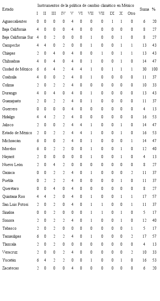 De los instrumentos considerados, 26 estados cuentan con un programa de cambio climático, 22 con un inventario de gases de efecto invernadero (de los cuales cinco se encuentran en los programas), 23 con una ley de cambio climático y tres con un reglamento de dicha ley. A su vez, existen seis estados con estrategias de cambio climático, tres de las cuales están agrupadas en una estrategia regional, y 17 atlas de riesgos. Únicamente nueve de los programas de cambio climático y dos estrategias están vigentes de la actual administración de gobierno. Además de ello, existen 19 comisiones intersecretariales para el cambio climático, tres consejos estatales y dos fondos para el cambio climático. Por otra parte, 17 estados cuentan con un programa y una ley de cambio climático simultáneos: Baja California, Chiapas, Chihuahua, Ciudad de México, Coahuila, Colima, Durango, Guanajuato, Hidalgo, Jalisco, Estado de México, Michoacán, Quintana Roo, San Luis Potosí, Sonora, Tamaulipas y Veracruz.