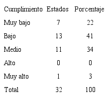 De acuerdo con los rangos establecidos, la mayoría de los estados se encuentran en un nivel bajo y muy bajo de cumplimiento (63 %), once estados con un cumplimiento medio, y sólo uno con un cumplimiento muy alto (Tablas 1 y 2 y Figura 1).