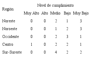 Al regionalizar el país se observa lo siguiente: las regiones noreste y noroeste presentaron la mayor cantidad de estados con nivel de cumplimiento muy bajo, mientras que la región sur-sureste presenta mayor número de estados con un nivel medio de cumplimiento (Figura 3). Siguiendo las regiones establecidas, todas tienen los tres niveles de cumplimiento inferiores, a excepción de la región centro que también tuvo un cumplimiento muy alto, que es precisamente donde se encuentra la Ciudad de México, que ha presentado el mayor nivel de cumplimiento observado (Tabla 3).