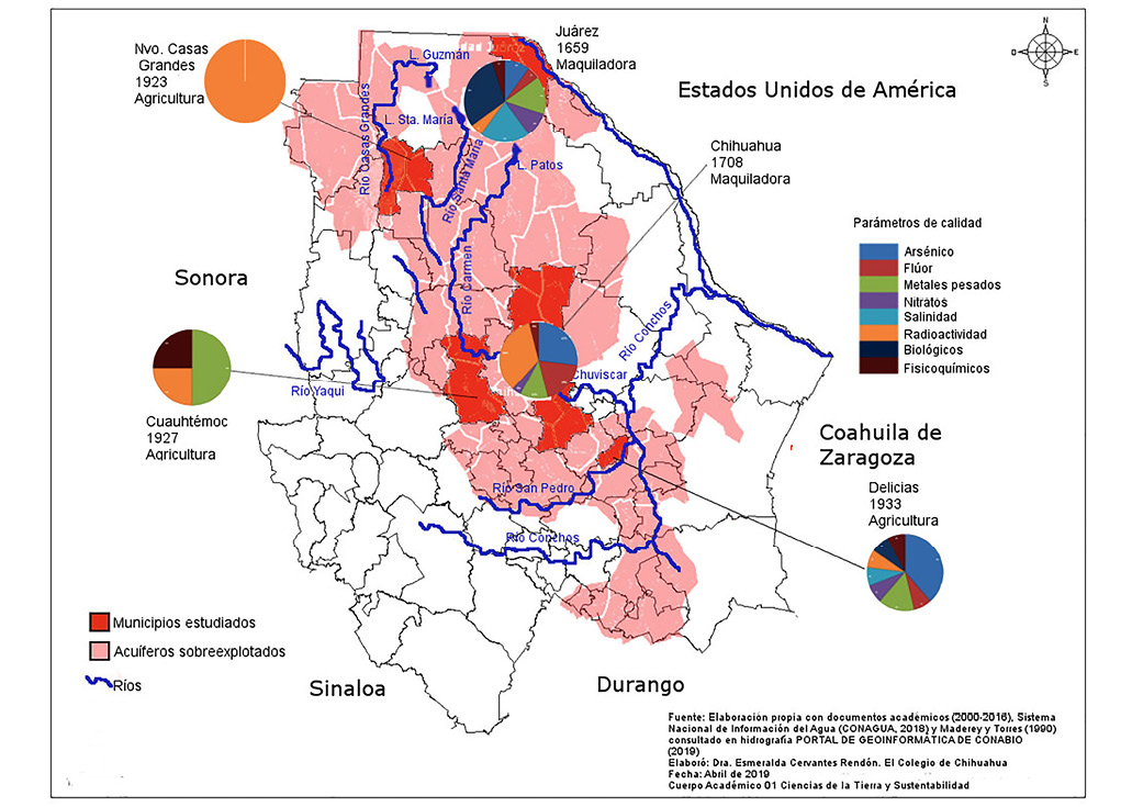 Por lo que toca a la cuestión de la contaminación, los parámetros estudiados en el municipio de Juárez reportan presencia de metales pesados, mientras que en Chihuahua destacan problemas de radioactividad, arsénico y flúor en el agua. Para Cuauhtémoc y Delicias se han analizado los metales pesados y arsénico, mientras que en Nuevo Casas Grandes no se identificaron estudios de contaminación, lo que no quiere decir que no exista este problema (Figura 1 y Tabla 1).