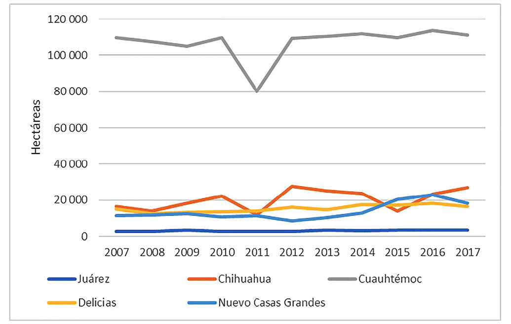 En cuestión de producción agrícola, el municipio de Cuauhtémoc es el que cuenta con una mayor superficie cosechada, superando en la mayoría de los años las 100 mil hectáreas; por su parte, los municipios de Delicias, Chihuahua y Nuevo Casas Grandes tienen entre 11 y 20 mil hectáreas. Este último municipio presenta un incremento de la superficie a partir del 2010, mientras que Juárez es el de menor superficie incrementando desde el 2007 de 2 mil a 3 mil quinientas hectáreas (Figura 2). Entre los cultivos cíclicos-perennes con mayor superficie para el 2017 se encuentran maíz, algodón y sorgo forrajero, mientras que la nuez empieza a tomar posición, no solamente en el Valle de Juárez, sino también en los municipios de Nuevo Casas Grandes, Delicias y Chihuahua, ya que tiene un mayor valor de producción. Por otra parte, aunque en Cuauhtémoc no se identifique a la manzana como la de mayor superficie sembrada, ya que se encuentra en cuarto lugar con una superficie de 8 274 ha, es la que tiene un mayor valor de producción en el municipio (SIAP, 2017).