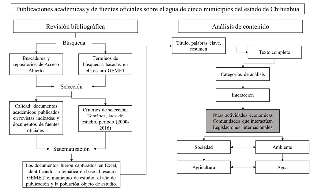 Como una primera aproximación a las interacciones socioambientales, se realizó un diseño de investigación bibliográfica (Tamayo, 2017) donde se identificaron tres categorías para un análisis de contenido de los documentos recopilados en la búsqueda (Figura 3), para los municipios de Juárez, Chihuahua, Cuauhtémoc, Nuevos Casas Grandes y Delicias.2
