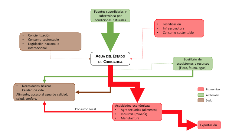 En cuanto a las salidas se identificó que, de acuerdo con los datos de extracción de los acuíferos, en los municipios de Cuauhtémoc, Delicias y Nuevo Casas Grandes, la mayoría es concesionada para uso agropecuario (64 %, 90 % y 93 % respectivamente), mientras que en el caso del municipio de Chihuahua se enfrentan problemas de abastecimiento de agua de calidad para consumo humano. Por ello en la Figura 4 se marca en menor grosor la flecha de salida hacia la sociedad y con mayor grosor la salida hacia el sector económico.