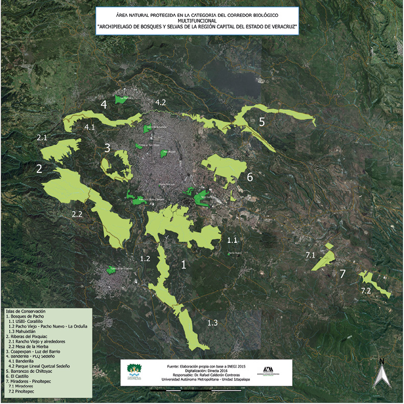 El decreto de esta ANP (Ley N. CXCI-006, 2015) deriva de la confluencia de una administración estatal que tuvo como objetivo incrementar las áreas de protección de los ecosistemas de Veracruz, la propuesta innovadora del esquema de Archipiélago por iniciativa de un grupo académico (Halffter, 2016) y la trayectoria de luchas de defensa ambiental en la región con una constante demanda de conservación por parte de la sociedad civil organizada (Paré y García Campos, 2018). El decreto de esta ANP (primera en el país con denominación de “archipiélago”) refuerza legalmente la Reserva Ecológica de carácter restrictivo y de aprovechamiento productivo establecida previamente en el Programa de Ordenamiento Urbano de la zona conurbada de 1998, que define a estas zonas como no urbanizables o con una densidad baja de viviendas por hectárea.