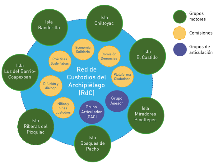 La Red de Custodios funge como una plataforma en la que participan diferentes actores que buscan el cuidado de estos espacios a través de procesos orientados a una gestión compartida del territorio. Inicialmente conformada por habitantes de una zona colindante a una de las siete islas y con una significativa historia de activismo ambiental (Paré y Gerez, 2012; Paré y García Campos, 2018), se ha consolidado como una iniciativa ciudadana que integra actualmente aproximadamente a 300 miembros con participación intermitente de diferentes zonas o islas verdes del archipiélago, ocupaciones, edades y sectores sociales, contando con aproximadamente 80 personas activas en el trabajo de la red en las islas y con 1 800 seguidores en Facebook. Se trata de una red autogestionada, que no cuenta con un registro legal y está abierta a la participación de cualquier persona interesada, habitante o no de las islas del ANP. Al fungir como una plataforma multiactoral de negociación y acuerdos en pro de la sustentabilidad local, comparte algunas características con instancias como los consejos civiles y comités temáticos o territoriales; sin embargo, se distingue de estos grupos institucionalizados al mantener un carácter de gran apertura a una pluralidad de actores y enfocarse a la realización de diversas acciones colectivas.