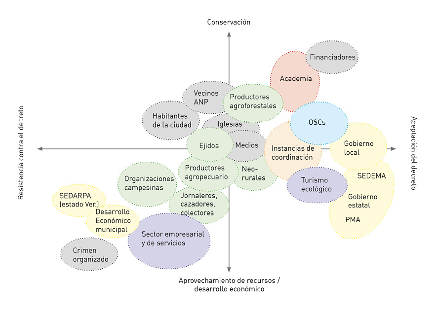 En la Figura 3 se visibilizan las diferentes tendencias entre los actores dependiendo de la orientación de sus intereses y la relación que tienen respecto al decreto como norma ambiental. Por un lado, hay un grupo de actores que está a favor de la conservación y considera el decreto como una herramienta legal importante para poder detener la tendencia destructiva. Por otro lado, el decreto representa una restricción para personas interesadas en fraccionar y urbanizar terrenos (algunas personas propietarias/ejidatarias, empresarias y en búsqueda de viviendas fuera de la ciudad) y para las personas que viven de actividades productivas no sustentables dentro del ANP. Es probable que algunos de estos actores aún no se hayan manifestado porque el ANP ha tenido sólo escasos impactos concretos más allá del decreto legal, lo que representa el escenario general de las ANP en México. Resalta la diversidad de intereses en algunos sectores que pueden llegar a ser contradictorios (por ejemplo, las políticas de distintas instancias de gobierno) y/u oportunidades de conciliar intereses entre sectores (por ejemplo, el turismo ecológico y la producción cafetalera bajo sombra).