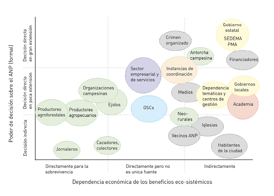 El análisis de las relaciones de poder entre actores aporta elementos importantes para comprender panoramas socioambientales complejos; las relaciones sociales crean las condiciones en las que diferentes actores toman decisiones sobre el uso y manejo de los ecosistemas, además de que definen los beneficiarios de los mismos (Martín-López et al., 2019; Berbés-Blázquez et al., 2016). Adaptamos el Marco de Escala Cruzada Influencia-Dependencia (Martín-López et al., 2019) centrado en la escala local, porque esta correlación permite indagar sobre las relaciones sociales que condicionan el estado de los ecosistemas y la vulnerabilidad de los actores. En la Figura 4 observamos una conformación actoral en donde los actores que dependen directamente de los beneficios ecosistémicos (jornaleros/as y campesinos/as) no tienen una decisión directa sobre el decreto y las reglas de gestión, mientras que hay actores que solamente dependen indirectamente y tienen la posibilidad de toma de decisión directa (autoridades ambientales y aliados). Los más vulnerables en este sentido son campesinos/as sin tierra y en menor escala los que son propietarios de la tierra. Este panorama tiene también una correlación con las diferencias socioeconómicas entre actores. Cabe mencionar que se percibe una discrepancia significativa entre el poder formal y real ya que, en esta última situación, el gobierno tiene menos poder de incidir en la práctica.