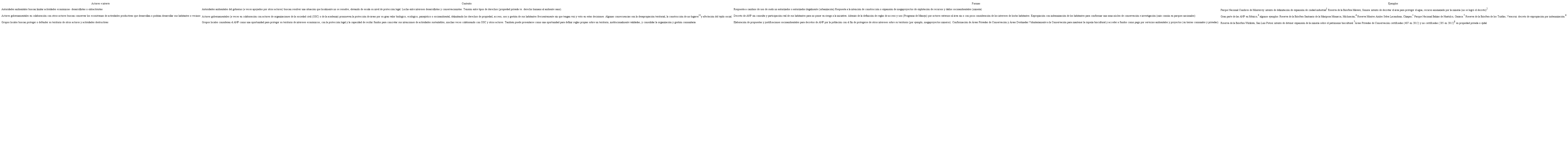 Para ello, revisamos literatura acerca de conflictos socioambientales en las ANP en México, ya que en el conflicto se visibilizan los intereses, resistencias y acciones en cuestión (Foucault, 1988; Azuela y Mussetta, 2009). Seleccionamos 12 casos que nos permiten destacar que hay distintas conformaciones actorales e intereses que, de manera aislada o articulada, motivan los decretos y el manejo de las ANP (Cuadro 1, Anexo: 1) autoridades ambientales buscan limitar actividades económicas-desarrollistas o extractivistas apoyándose en la ley; 2) actores gubernamentales en colaboración con otros actores buscan proteger los ecosistemas de actividades productivas que desarrollan o podrían desarrollar sus habitantes y/o vecinos delimitando derechos de acceso y uso de los recursos, y 3) grupos locales buscan proteger o defender su territorio de otros actores y actividades destructivas. Estas conformaciones no son necesariamente excluyentes, y son meras aproximaciones a un panorama actoral complejo.