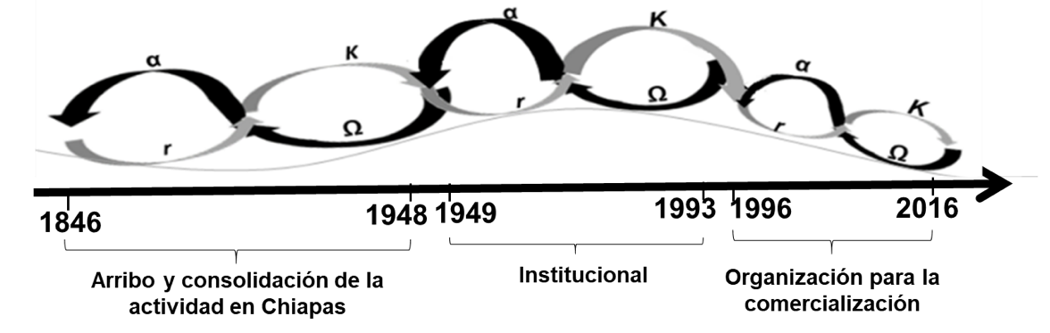 De acuerdo con los ciclos de renovación adaptativa, a lo largo de la historia de la caficultura en Chiapas identificamos tres grandes periodos ―que consideran el cambio de las características del sistema―: 1) periodo de arribo y consolidación de la actividad en Chiapas (1846-1948); 2) periodo institucional caracterizado por la regulación de la actividad de la caficultura y promoción del cultivo (1949-1993), y 3) periodo de organización para la comercialización, caracterizado por la conformación de organizaciones y mercados de especialidad (1994-2016) (Figura 2).