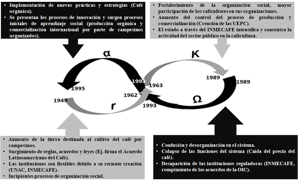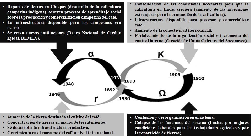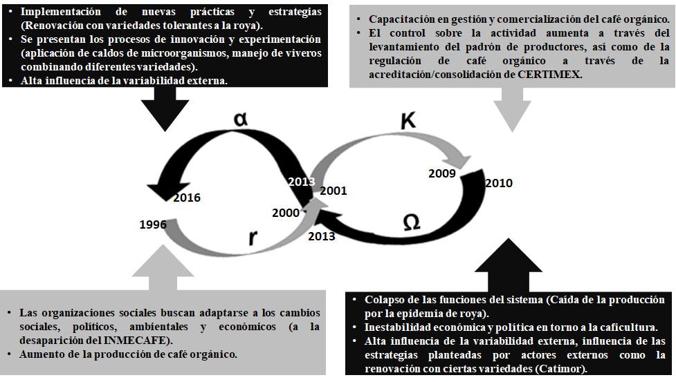 Las crisis recurrentes en el sistema de café pueden verse como fases de liberación, cuando los mecanismos de control y organización se rompen, por lo que la conectividad y los recursos se van perdiendo, la incertidumbre aumenta y el sistema puede presentar un comportamiento caótico; se caracteriza por una alta flexibilidad, y reducida resiliencia. Ejemplo de ello fueron los conflictos sociales derivados de la Revolución mexicana, la desaparición del Instituto Mexicano del Café (INMECAFÉ) y la epidemia de la roya. Ante tales eventos las familias caficultoras implementaron estrategias que representan mecanismos para reducir los impactos de la crisis y asegurar la reproducción de sus condiciones de vida. Esto permitió la reorganización del sistema y su resiliencia.