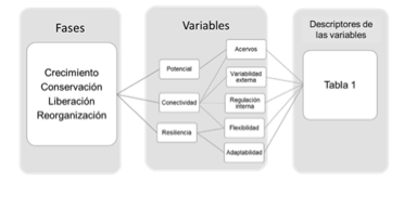 Las principales variables utilizadas para este estudio se escogieron de las propuestas de Holling (2001) y Holling y Gunderson (2002: 33): 1. potencial; 2. conectividad, y 3. resiliencia. Estas tres variables se describen en función de la cantidad y calidad de los capitales (recursos), del grado de control de la variabilidad externa, de los procesos de regulación interna, y de la flexibilidad y adaptabilidad del sistema (Figura 1, Tabla 1) (Abel et al., 2006; Nkhata et al., 2008; Simmie y Martin, 2010; Daedlow et al., 2011; Fath et al., 2015).