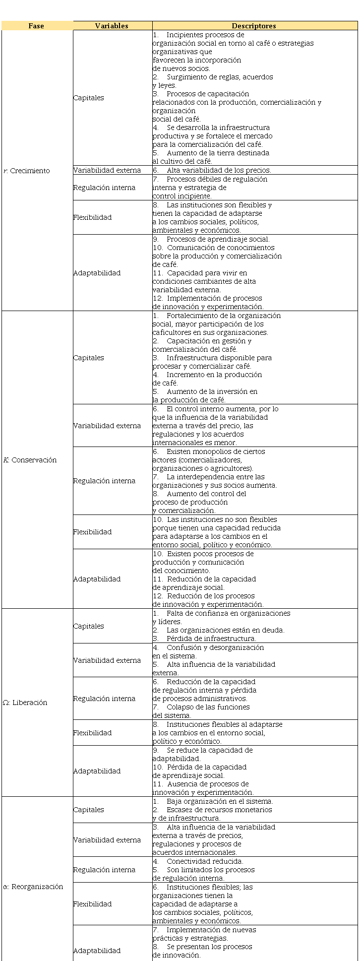 Para el análisis se usó la propuesta teórica de Holling sobre los ciclos adaptativos, la cual ha sido considerada como un modelo heurístico (Holling y Gunderson, 2002), una metáfora (Angeler et al., 2015), un metamodelo (Cumming y Collier, 2005) y un enfoque diagnóstico (Beier et al., 2009). En el presente estudio se utiliza el modelo heurístico de ciclos adaptativos como una herramienta para entender las transformaciones de la caficultura en Chiapas. Para lo anterior se identificaron descriptores de las principales variables que permitieron definir cada etapa del ciclo adaptativo en la historia de la caficultura (Tabla 1).