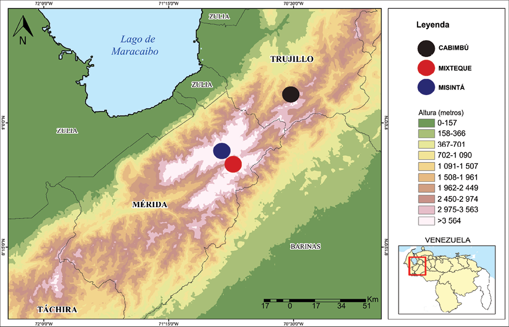 Se seleccionaron tres comunidades venezolanas y una colombiana para un enfoque comparativo. Estas cuatro comunidades son representativas de la intensificación de la agricultura en los páramos de ambos países. Las comunidades de Misintá (517 habitantes) y Mixteque (395 habitantes) están ubicadas en los Andes venezolanos, particularmente en el municipio Rangel del estado de Mérida (Figura 1). Ambas, cercanas a la ciudad de Mérida (1 h 30 min de distancia aproximadamente), se caracterizan por la presencia de instituciones estatales. Este es el caso particular de Mixteque, que se encuentra dentro del Parque Nacional Sierra Nevada, creado en 1952 y administrado por INPARQUES2 a través de un plan de ordenamiento (PORU)3 (República de Venezuela, 1993). Los principales cultivos de esta zona agrícola son la papa, la zanahoria y el ajo.