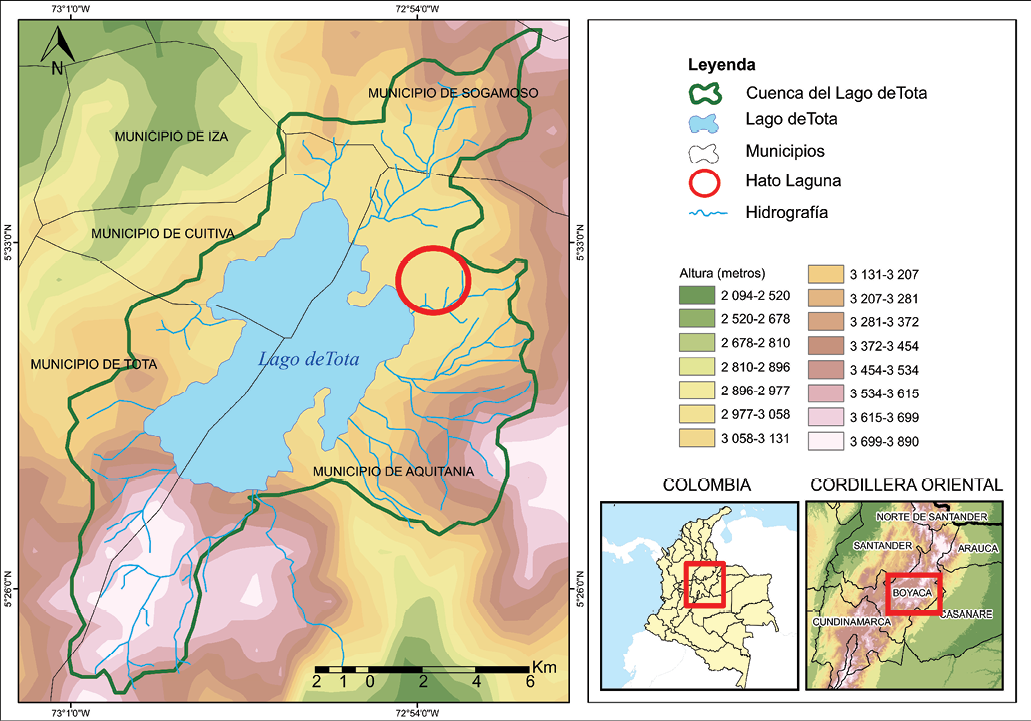 Finalmente, seleccionamos la comunidad de Hato Laguna5 (535 habitantes) en el municipio de Aquitania, ubicado en el departamento de Boyacá (cordillera oriental de los Andes colombianos) (Figura 2). La característica principal de esta comunidad es su ubicación a la orilla del lago de Tota,6 el lago más grande de Colombia y, por lo tanto, un importante eje de estudio y de protección ambiental. Debido a este contexto, la cuenca de este lago es administrada por la corporación autónoma CORPOBOYACÁ,7 la cual ha implementado un plan de desarrollo o POMCA8 (CORPOBOYACÁ, 2005). Los principales cultivos en esta región son la cebolla larga, la papa y el frijol.