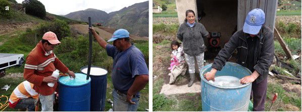 Además de la resistencia que produce en el trabajador agrícola el uso de EPP, también se identifican prácticas de sobreexposición a pesticidas, en particular durante las fases de preparación y mezcla para la aplicación. Durante nuestro trabajo de campo fuimos testigos de una escena común en el páramo de ambos países: un agricultor mezcló varias sustancias tóxicas con un palo, sin guante y mascarilla (Figura 6). Esta fase de preparación, que dura sólo unos minutos, se repitió unas cinco o seis veces. Mientras tanto otros dos agricultores, sin ninguna protección y con el viento de frente, aplicaron la solución de pulverización en la finca, labor que duró aproximadamente cuatro horas. Al final, los tres agricultores limpiaron el equipo con agua del sistema de riego. Esta actividad se acompañó de descargas de agua que contenían las sustancias activas.