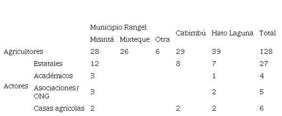 Los datos fueron recolectados a través de una serie de entrevistas semiestructuradas con 28 agricultores en Misintá, 26 en Mixteque, 29 en Cabimbú (Venezuela) y 39 en Hato Laguna (Colombia); asimismo, seis entrevistas adicionales en otras localidades (Cuadro 1). También se llevaron a cabo 42 entrevistas con varios actores (instituciones estatales, organizaciones no gubernamentales, asociaciones, académicos y casas agrícolas) de los sectores de la agricultura y la gestión ambiental (Cuadro 1). Por instituciones estatales nos referimos a los ministerios de medio ambiente y agricultura de cada país.