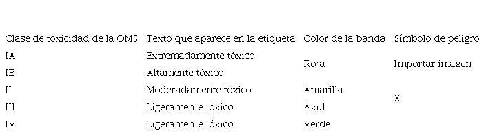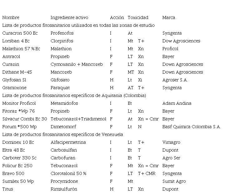 Notas: Acción: H: Herbicida; I: Insecticida; F: Fungicida. Toxicidad (indicada en el envase): ET: Extremadamente tóxica; AT: Altamente tóxico; MT: Moderadamente tóxico; LT: Ligeramente tóxico. Toxicidad según la base de datos AGRITOX del Instituto Nacional para la Investigación Agronómica (INRA, Institut national de la recherche agronomique, Francia): T+: Muy tóxico; T: Tóxico; Cmr: sustancia cancerígena; Xi: irritante; Xn: nocivo.