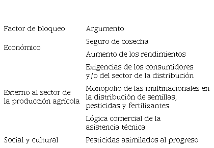 Finalmente, además de las cuestiones económicas, los intereses de las multinacionales y los comerciantes, y los factores culturales, los agricultores están totalmente atrapados en el paradigma productivista. Sin embargo, estos diferentes factores de bloqueo (Cuadro 4) no son exclusivos de los páramos estudiados, ya que diversos estudios realizados en los Andes colombianos (Schoell y Binder, 2009; Feola y Binder, 2010; Polanco et al., 2014) y en otros países del mundo (Guivant, 2003; Aubertot et al., 2005; Vanloqueren y Baret, 2008; Wagner, 2016), arrojan resultados similares.